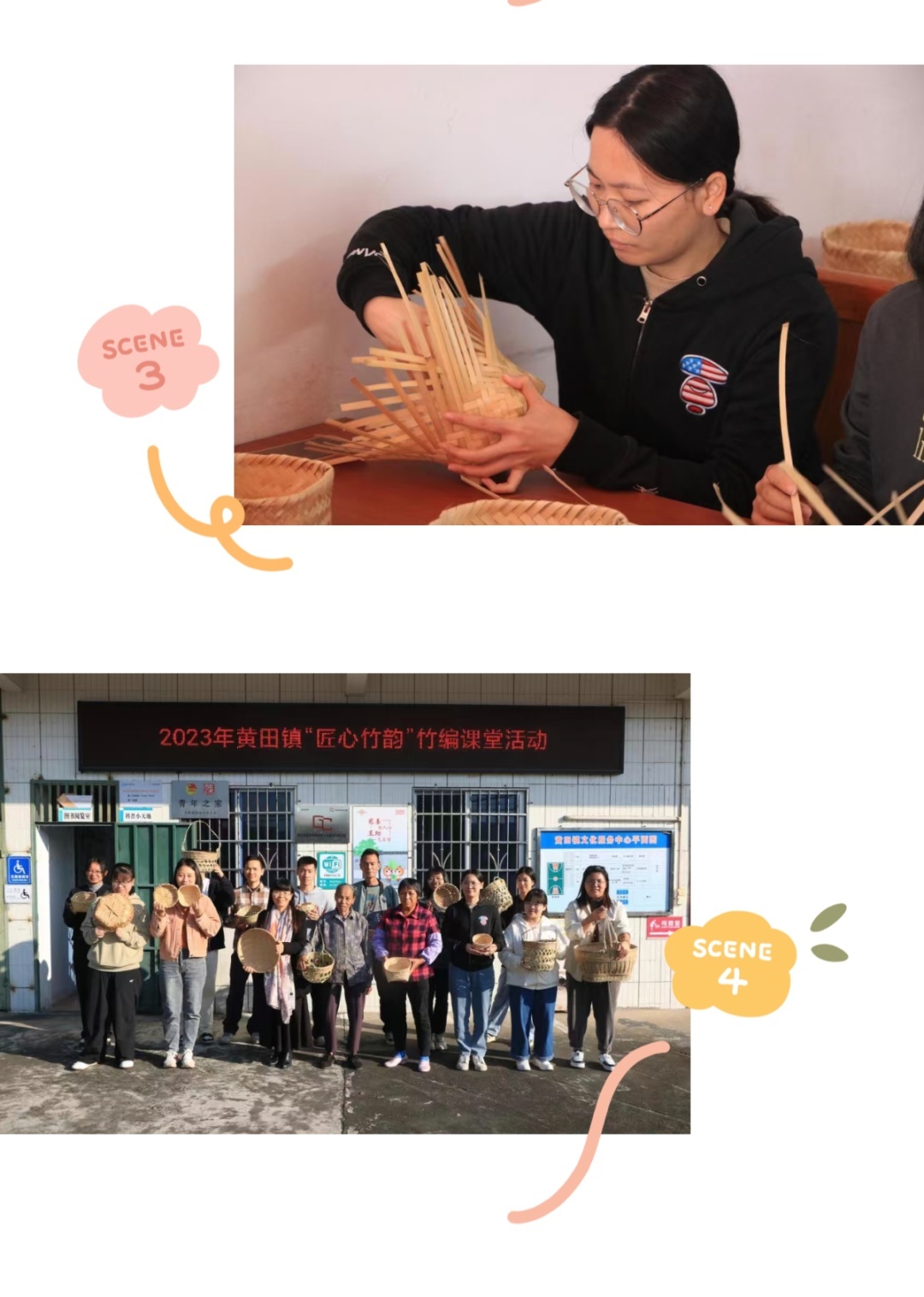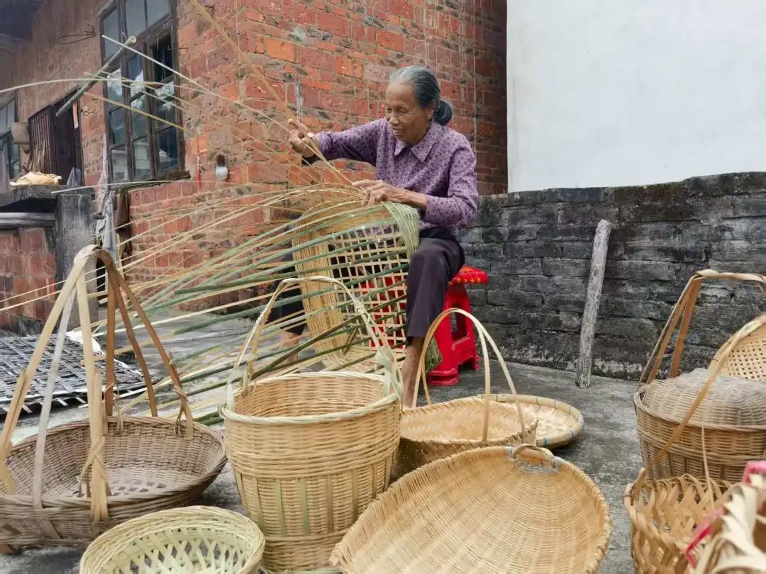 “竹编要经‘起底、编织、锁口’三道工序,就像盖房子得先打地基。”在黄田镇“匠心竹韵”竹编研学课堂上,80岁的非遗传承人陈娇一边示范劈篾,一边向学员讲解。