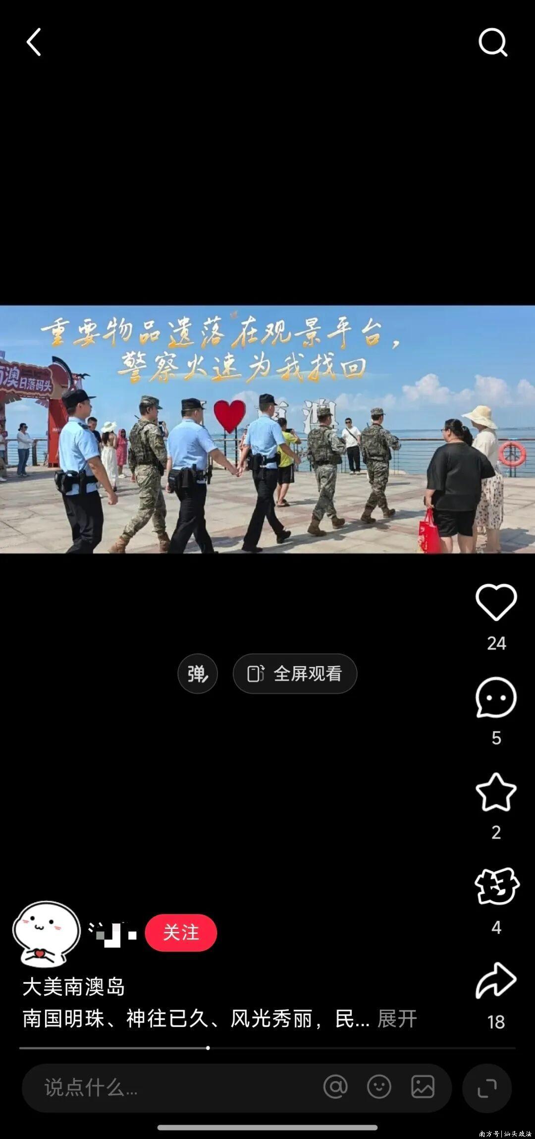 与此同时,在南澳北回归线标志塔,一名游客捡到了一部手机并将其交到了现场执勤民警的手中。经对比确认,这正是陈先生遗失的手机。最终,民警把手机送回到陈先生手中。