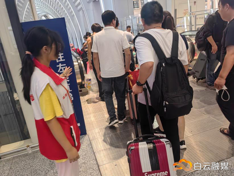 广州白云站青年志愿服务队在进出站口、售票大厅等关键区域提供志愿服务。