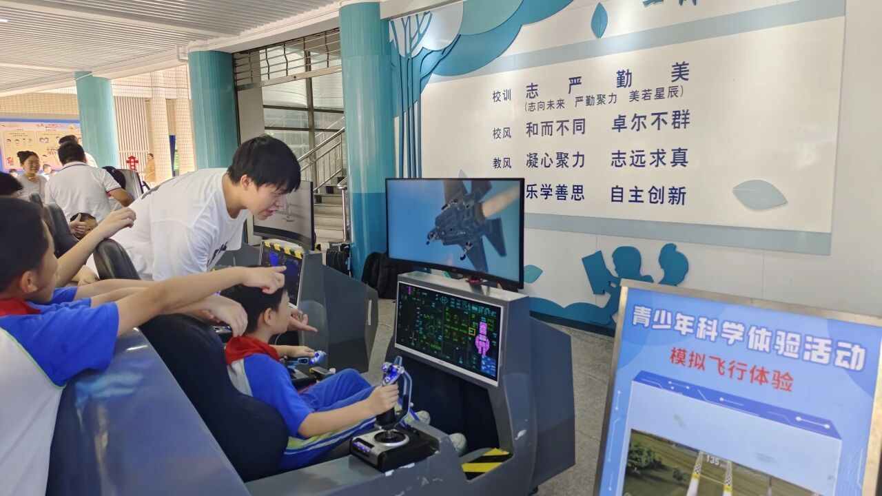 在人机互动区,方向盘遥控RC车风驰电掣、座舱式模拟飞行器直冲云霄、军事科技射击体验紧张刺激……10个互动项目让学生们过足了“科技瘾”,在游戏中感受了力与美的结合。