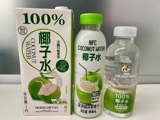 近日,每经记者从正规渠道购买了三款热销椰子水,经比对发现,同样在包装上显著标注“100%椰子水”的产品,在配料标识、保质条件及价格等方面存在明显区别。