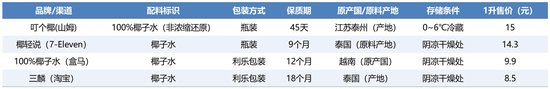保存条件上,山姆会员店购买的椰子水最严苛,要求0~6℃冷藏保存且保质期仅45天,而盒马和7-Eleven的椰子水均为阴凉干燥处保存,保质期分别长达12个月和9个月。