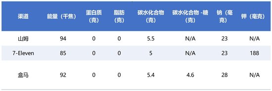 在产地标识上,山姆椰子水标注的是国内生产灌装地,7-Eleven标注的是原料产地,而盒马则标注原产国信息;在关键营养成分标注方面,7-Eleven是唯一标注钾含量的品牌(188毫克/100ml);盒马在碳水化合物项目下单独列出了糖含量(4.6克/100ml);而山姆虽标注了基本营养成分,却未提供钾含量信息。
