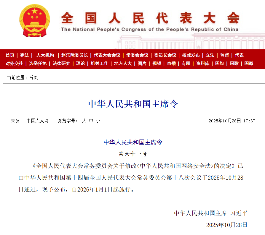 2025年10月28日,第十四届全国人民代表大会常务委员会第十八次会议表决通过关于修改《中华人民共和国网络安全法》的决定亿鑫网,新法将自2026年1月1日起实施。